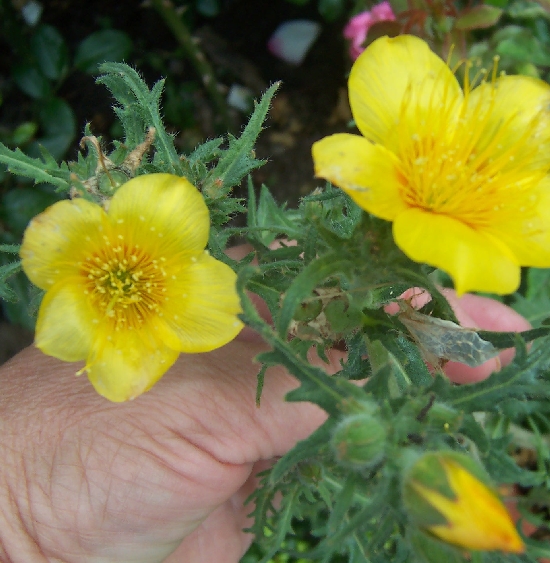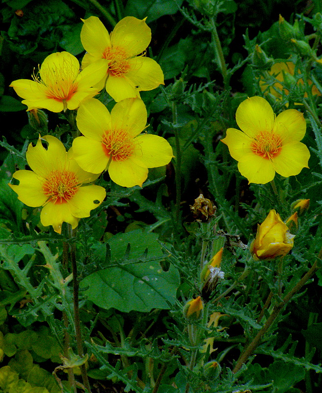 Liście i łodygi mają sinawy kolor, a od czerwca do września pojawiają się spore, złocisto-żółte kwiaty o pięciu sercowatych płatkach, z "czupryną" dekoracyjnych pręcików.