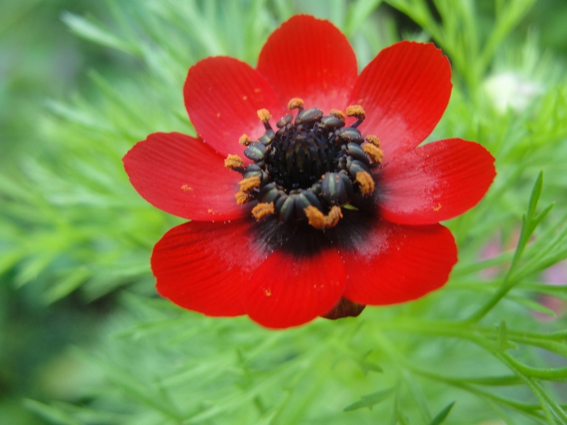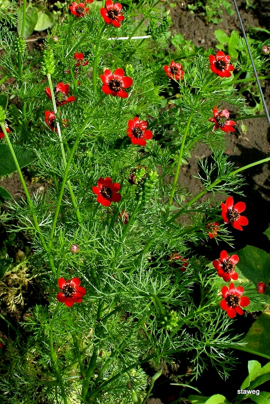 Liście ma wielokrotnie pierzastosieczne o wąskich odcinkach. Kwiaty na szczytach pędów zwracające uwagę intensywnym, czerwonym kolorem.