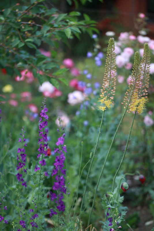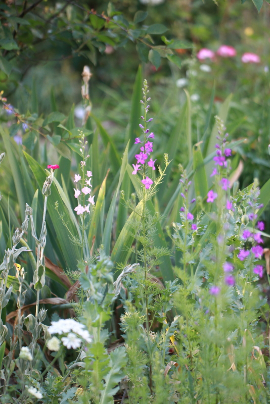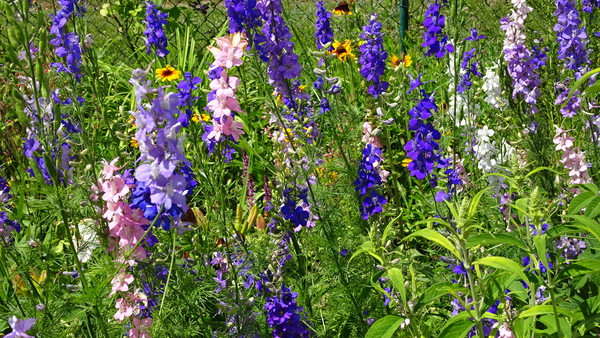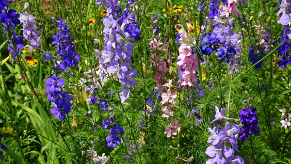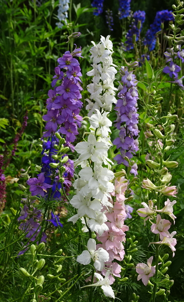 Kwiaty podobne do ostróżki w pięknych kolorach niebieskości, różów i bieli.