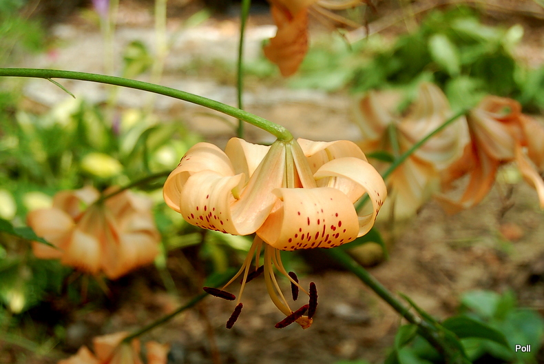 Kwiat: turbanowy, mocno wywinięty, skierowany do dołu, w kolorze pomarańczowo-łososiowym, mocno nakrapiany brązem