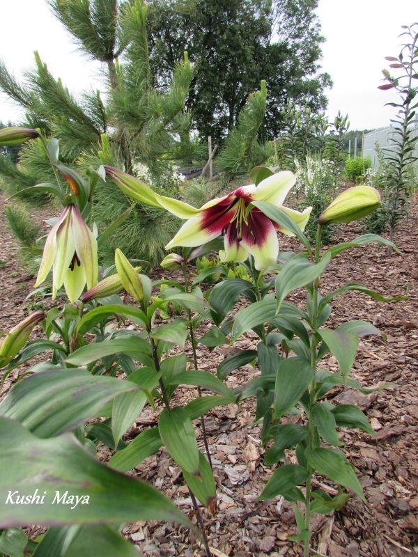 Uwagi: Kushi Maya to kolejna po Lankon, lilia będąca spektakularnym sukcesem hodowców wykorzystujących nowoczesne techniki hybrydyzacji. Uzyskano bowiem hybrydę, o której jeszcze kilka lat temu myślano, iż uzyskanie jej nie jest możliwe. Nową krzyżówkę uzyskano w skomplikowanym procesie laboratoryjntm, stosując proces 'embryo rescue' / ratowania zarodków', czyli pobranie zarodka z nasion i umieszczenie go w probówce zawierającej odpowiednią pożywkę. Dzięki temu skomplikowanemu procesowi, Kushi Maya' przypomina wyglądem Lilium nepalense, ale z cechami odporności, oraz siły wzrostu lilii orientalnych, więc może być uprawiana w takich warunkach, jak one.