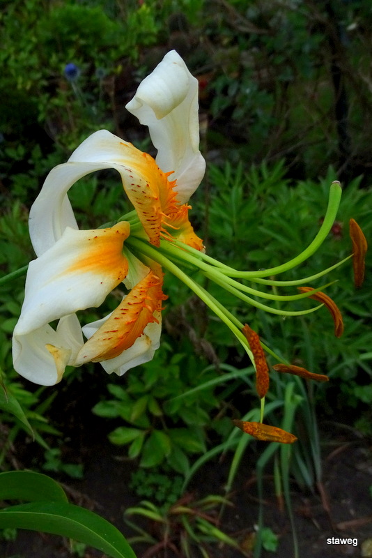 Kwiaty są też okraszone rozrzuconymi na powierzchni wewnętrznej płatków, brązoworudymi ozdobnymi brodawkami, tego samego koloru pylnikami i zieloną gardzielą. Żadna z lilii trąbkowych nie ma takich charakterystycznych kosmków (brodawek).
