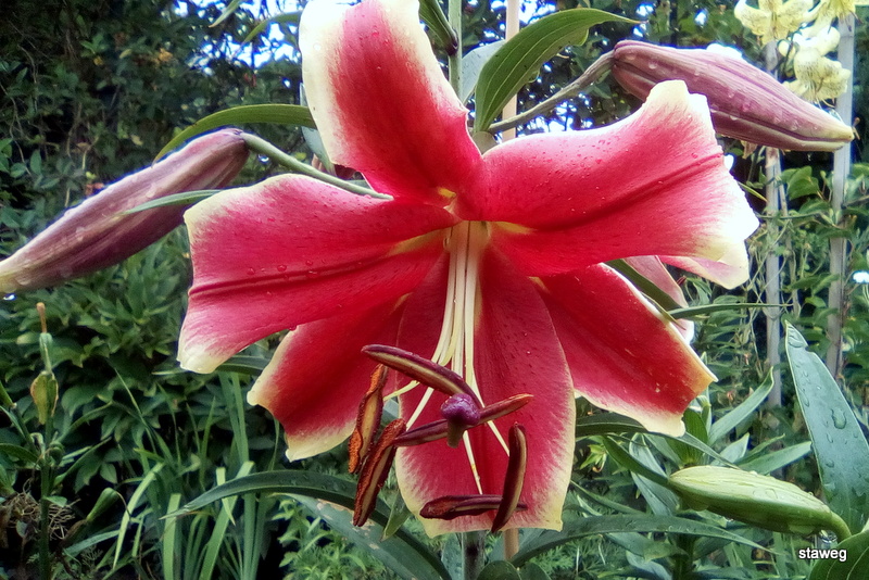 'Kushi Maya'. Ta hybryda jest nieco niższa (80-110cm), kwiaty są skierowane tym razem bardziej do góry i na boki, w kolorze czerwonym z kremowo-żółtymi brzegami.