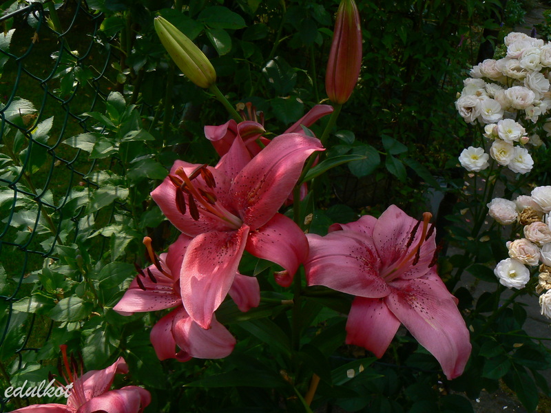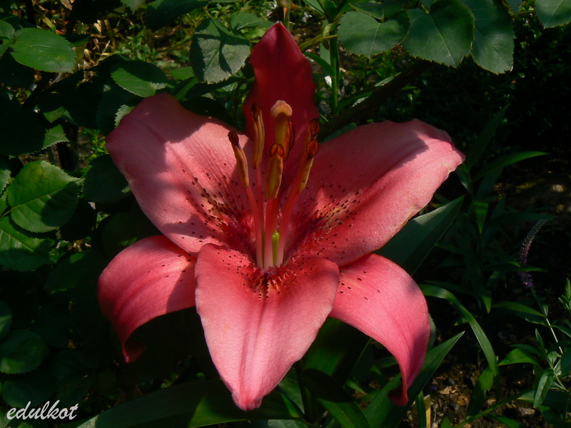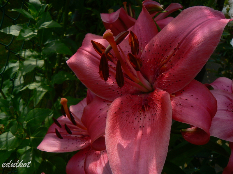 Kwiaty: czerwono różowawe jaśniejące do różowego, ciemniejsze kropki, średnie 14-15 cm;