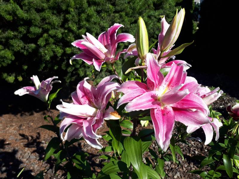 Kwiaty: duże, pełne, jasny do ciemnego różowego z białym nakrapianym środkiem;