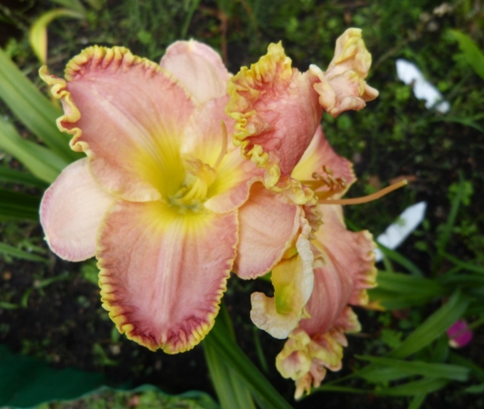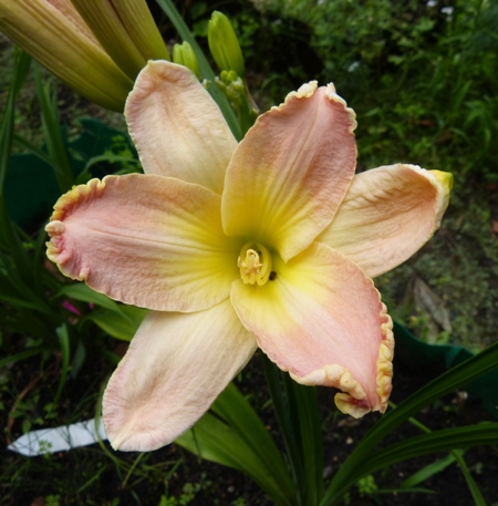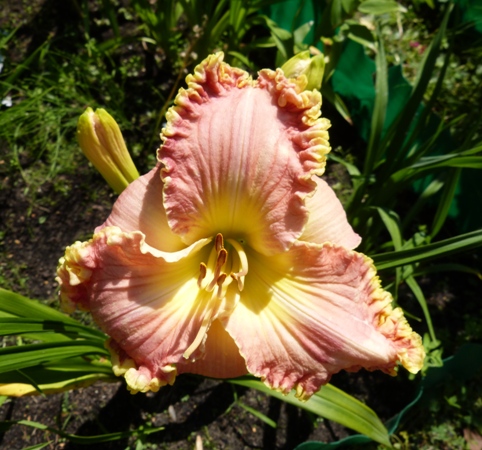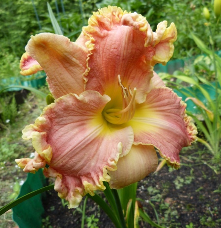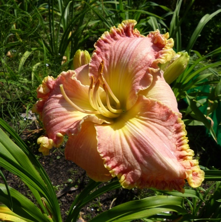 Hodowca Salter w ADS (AHS) 2005 wysokość 70 cm, kwiat o średnicy 15 cm, lekko pachnie, termin kwitnienia: 15 lipiec - 1 sierpień, może powtarzać kwitnienie, kolor: różowy z mocnym złotym brzegiem płatków i zieloną gardzielą