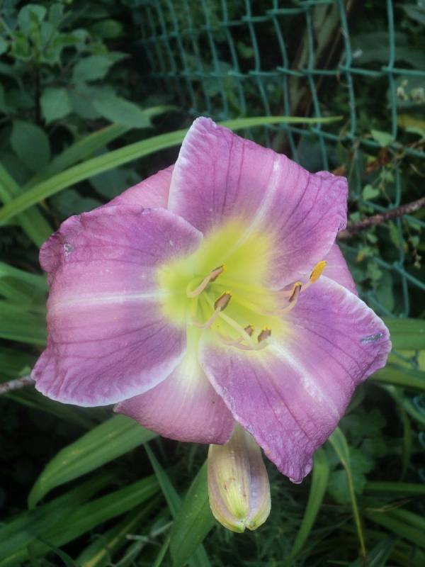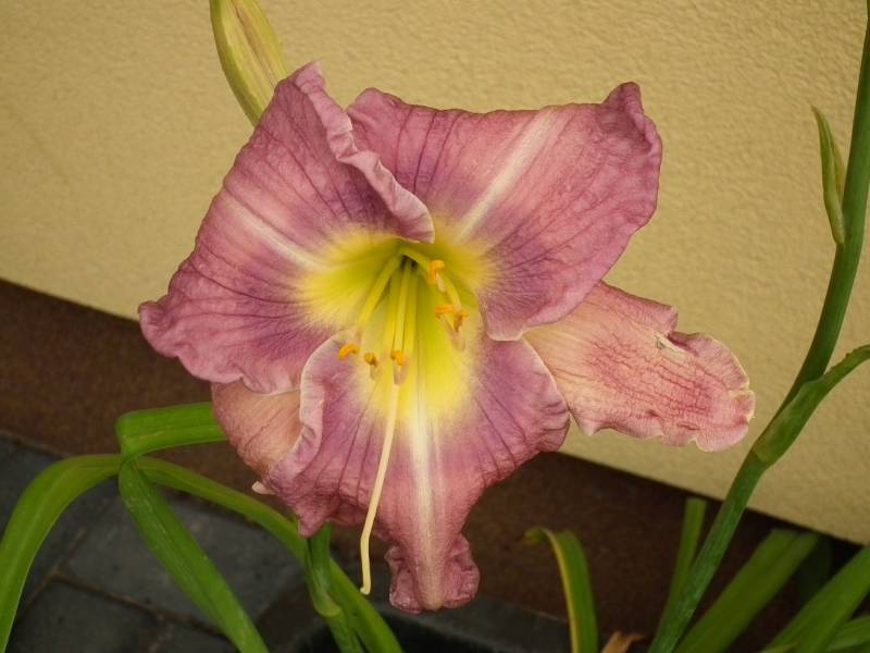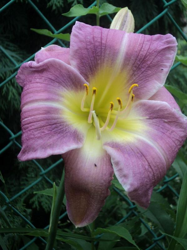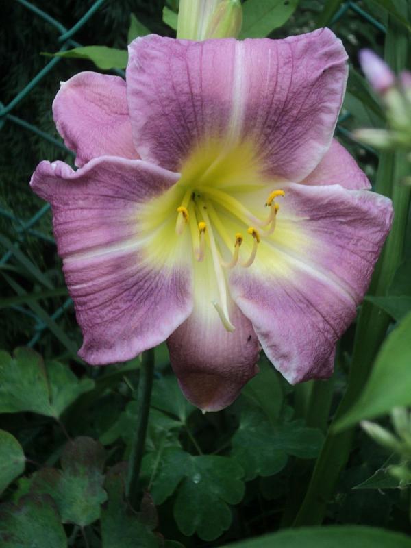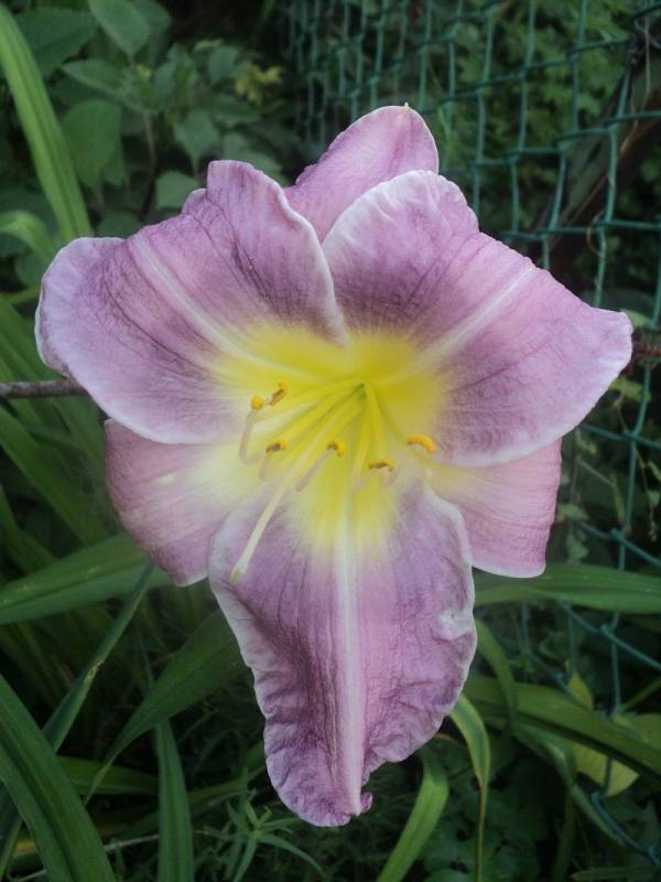 Kwiaty: w kolorze lawendowym , z żółto-zielonym gardłem ,delikatne marszczenie na brzegach płatków średnica 16 cm