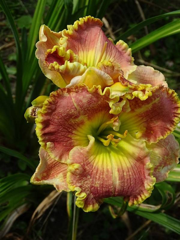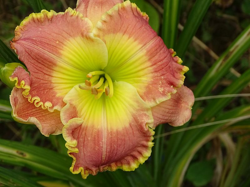 Kwiaty: różowe , z żółtym znakiem wodnym , zielonym gardłem i wyraźną żółtą falbanką , średnica kwiatu ok 16 cm.