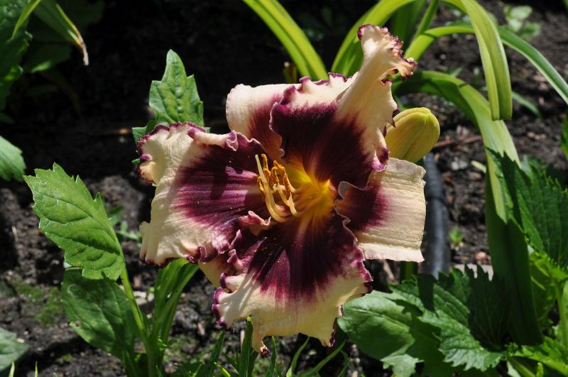 Kwiaty: kremowe z purpurowym okiem i purpurową falbanką, zielone gardło. Wielkość kwiatu 15 cm. Zakwita w 2-giej połowie czerwca i powtarza kwitnienie. Kwiat rozwija się wieczorem (typ nocturnal).