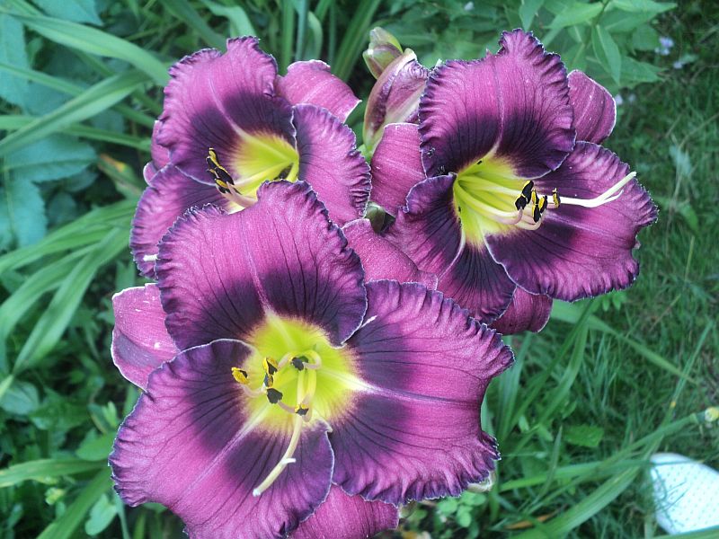 Kolor kwiatu purpurowy z ciemniejszym halo i ciemną koronką, gardziel żółta; średnica kwiatu 14 cm;