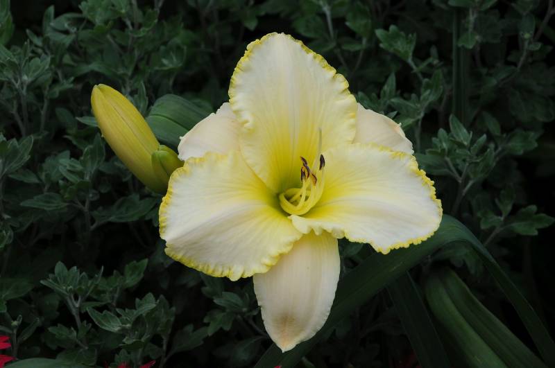 hodowca: Salter, 1995 wysokość: 60cm kwiat: o średnicy 15 cm w "prawie" białym kolorze z zieloną gardzielą i zielonkawą falbanką. termin kwitnienia: lipiec