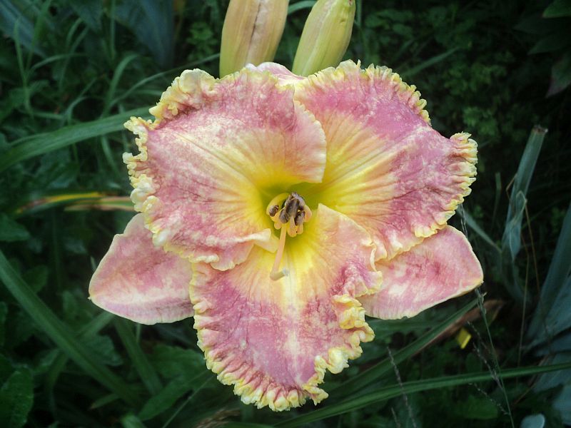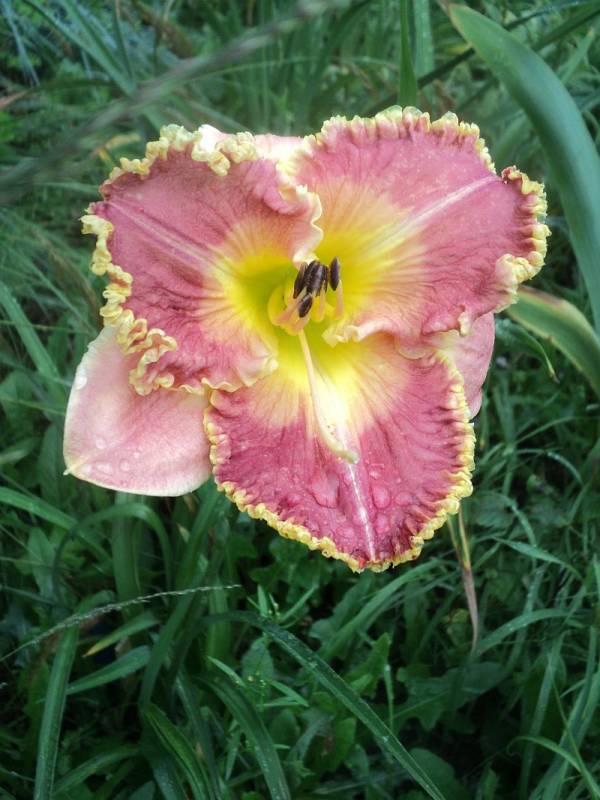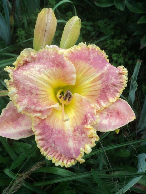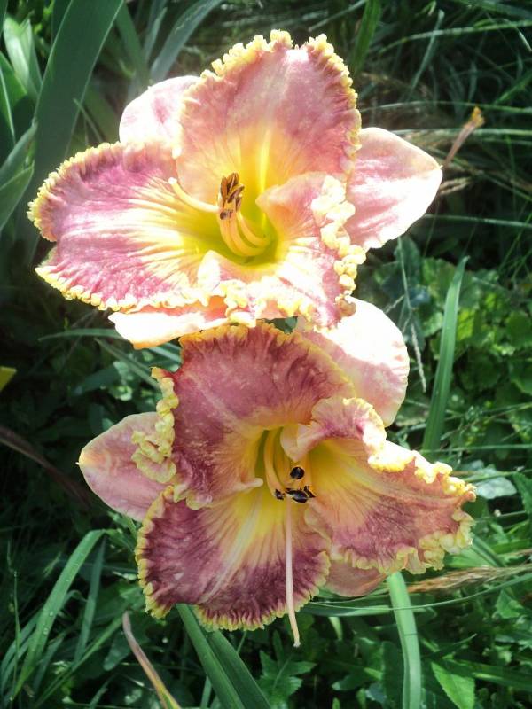Kwiaty: pudrowo różowe kwiaty z żółtą gardzielą i żółtą falbaną na brzegach płatków , średnica ok 14 cm.Wnętrze płatków marszczone . Zakwita w lipcu.