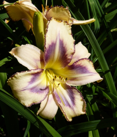 kwiat: o średnicy 15cm w kolorze kremowym z lawendowym okiem i fioletową falbanką oraz zieloną gardzielą, pachnący.