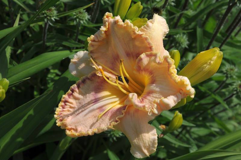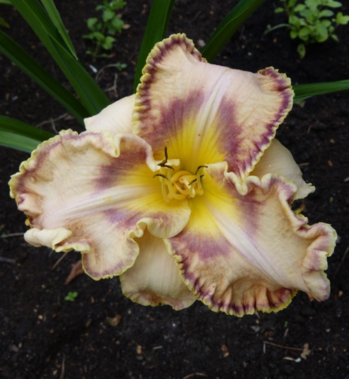 hodowca: Lambertson, 2003 wysokość: 50-60 cm kwiat: masywny kremowo-różowy z ciemniejszym okiem i żółtawym gardłem. Płatki z falbanką w ciemniejszym kolorze. termin kwitnienia: czerwiec-lipiec