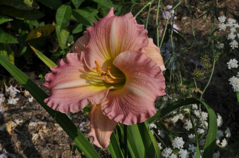 hodowca: Brown-E.C., 1981 wysokość: 60-70cm kwiat: o średnicy 13cm w kolorze delikatnego różu z dodatkową białą pręgą wzdłuż płatków. Gardziel zielona. Kwiaty mają piękny połysk. termin kwitnienia: czerwiec-lipiec