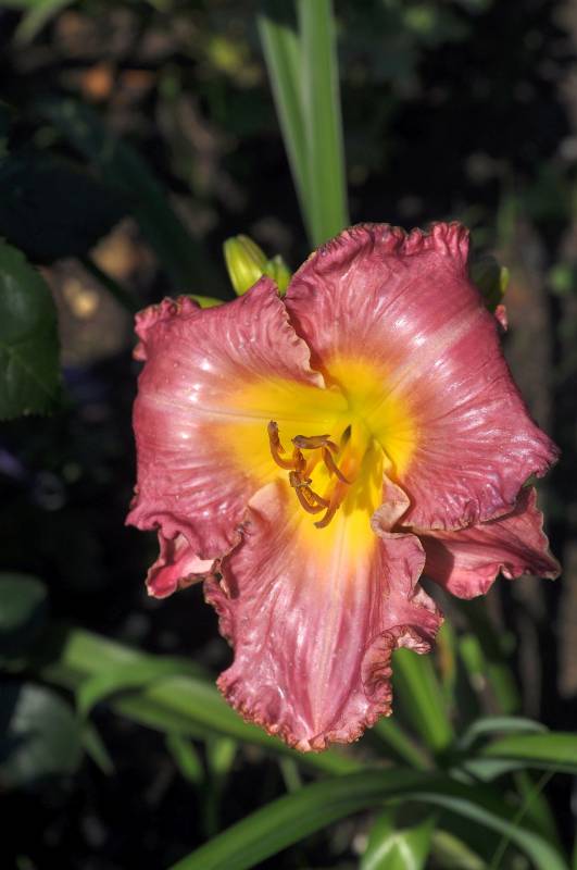 kwiat: o średnicy 15cm w kolorze blado fioletowym/różowym z żółtą gardzielą, najczęściej pełny, pachnący. Powtarza kwitnienie.