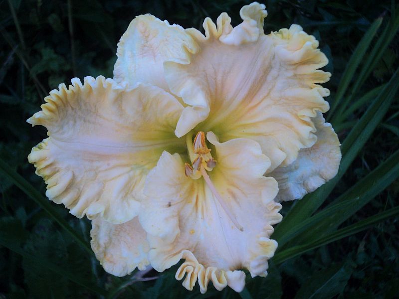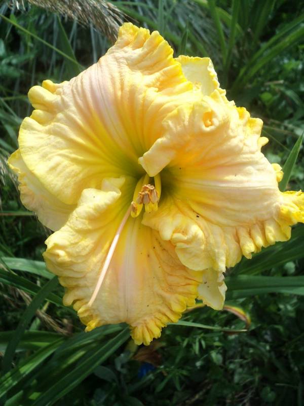 Kwiaty: koloru żółtego melona, gardło zielone , mocno falowany brzeg ,rzeźbione wnętrze płatków, średnica 15 cm. Zakwita w lipcu .