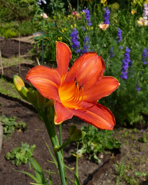 kwiat 18 cm, czysto czerwony z lekko zielonkawą gardzielą, może powtórzyć kwitnienie. Zakończenia sepali sprawiają wrażenie jakby się zawijały do góry