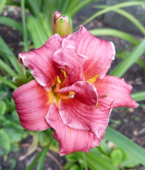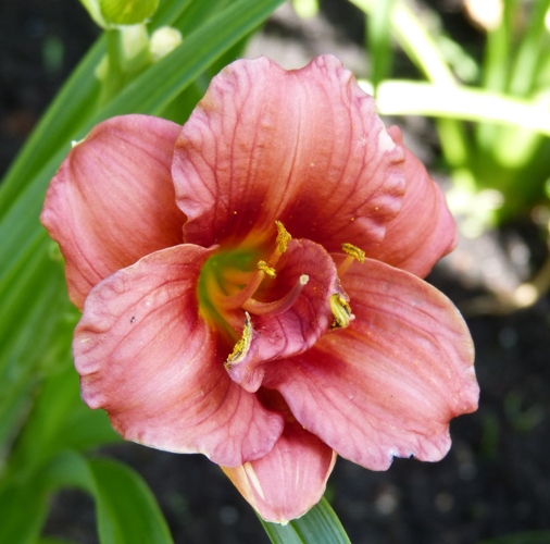 kwiat 5 cm, czerwony z zieloną gardzielą, podobno pełny w 100% i może powtórzyć kwitnienie. U mnie tylko czasem jest pełny (?).