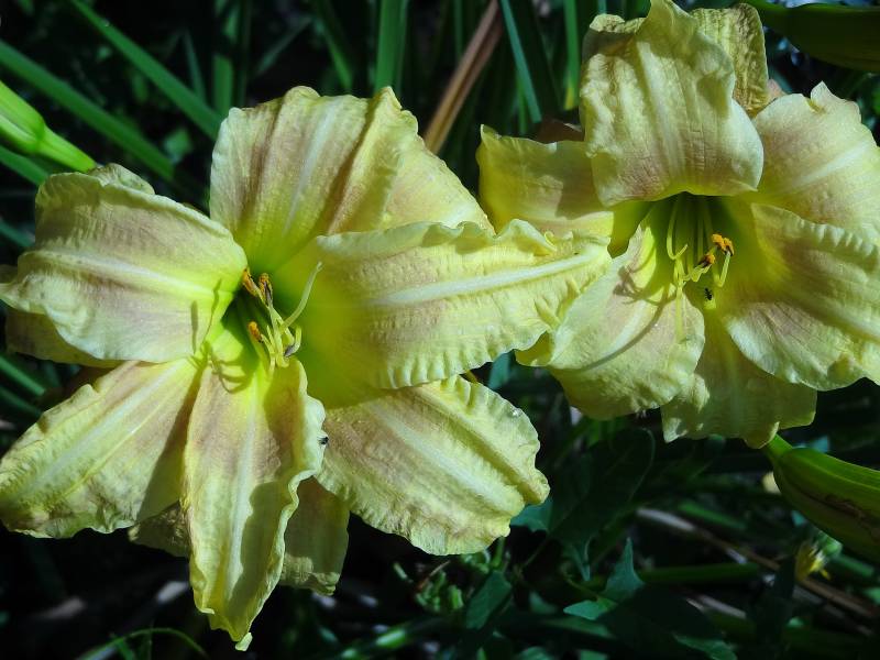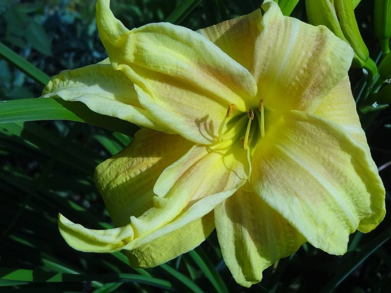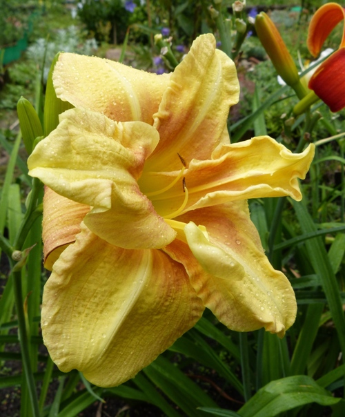 bloom 13 cm, podwójny, jasno żółty z czerwonymi cieniami na jasnożółtym oku i gardzieli.