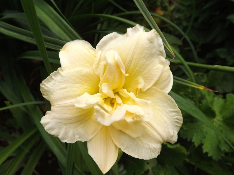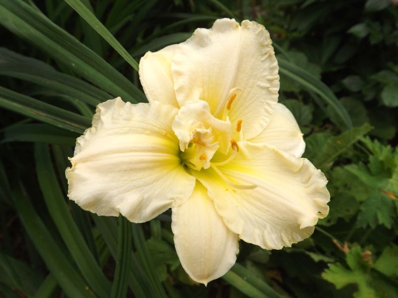kwiat 12 cm, pełny w 80%, kremowo biały z zielonkawą gardzielą, może powtarzać kwitnienie