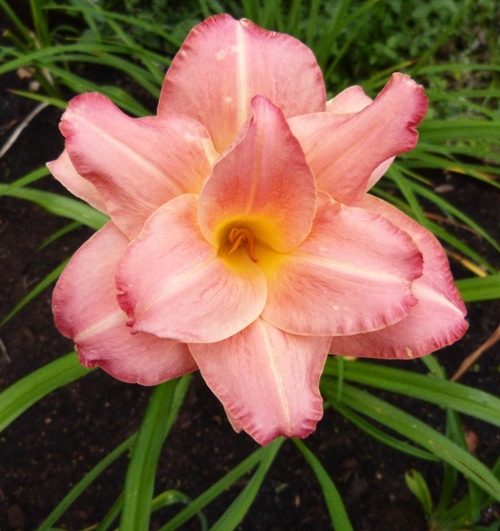 kwiat 15 cm, podobno powtarza kwitnienie, różowy przechodzący w kremowy kolor brzeg i strefę oka, z zieloną gardzielą.