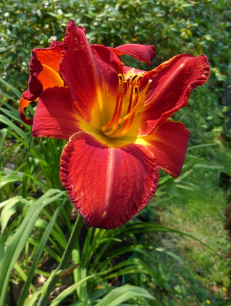kwiat 15 cm, ciemnoczerwony (albo wg innego tłumaczenia głęboka czerwień) z żółto-zieloną gardzielą
