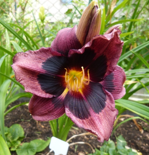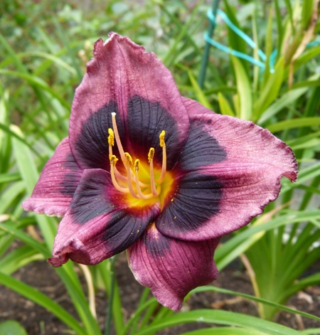 kwiat 11 cm, ciemno purpurowy z prawie czarnym okiem z żółto zieloną gardzielą, może powtarzać kwitnienie.