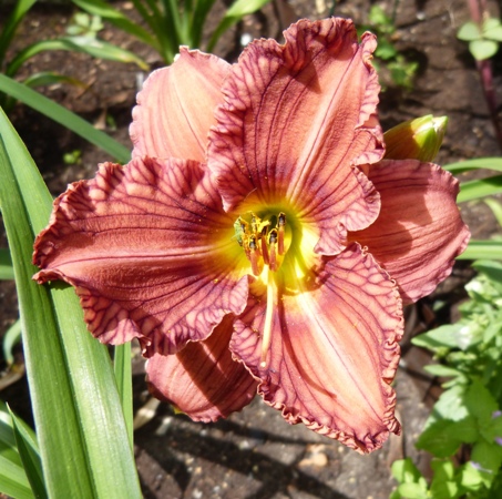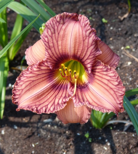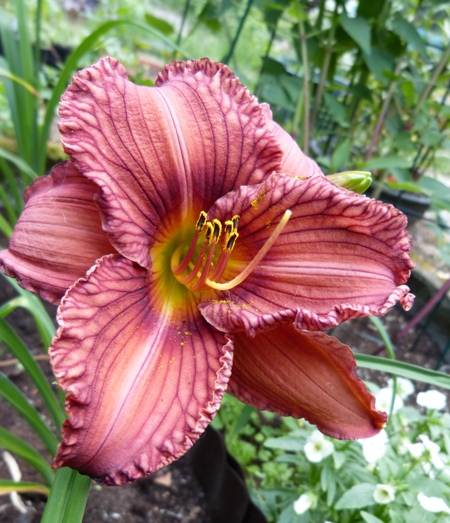 kwiat 12 cm, wg AHS to jasno brązowy z wąskim fioletowym okiem i małą zieloną gardzielą a wg mnie to "brudny" róż z ciemnymi żyłkami na płatkach