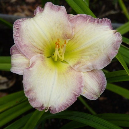 kwiat 14 cm, kreomowy z lawendową lamówką i zieloną gardzielą.