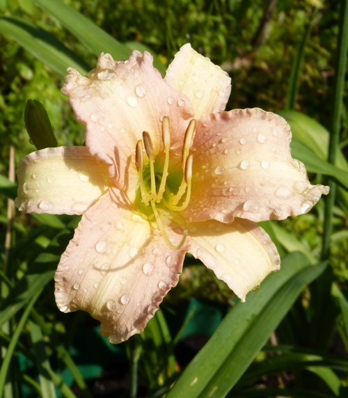 Kwiaty pojedyncze, płatki srebrno-różowe,pofalowane, żółtozielona gardziel, pylniki żółte,
