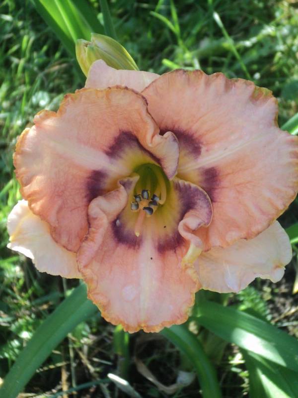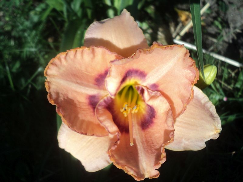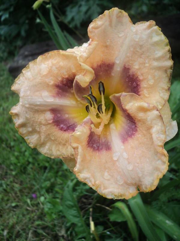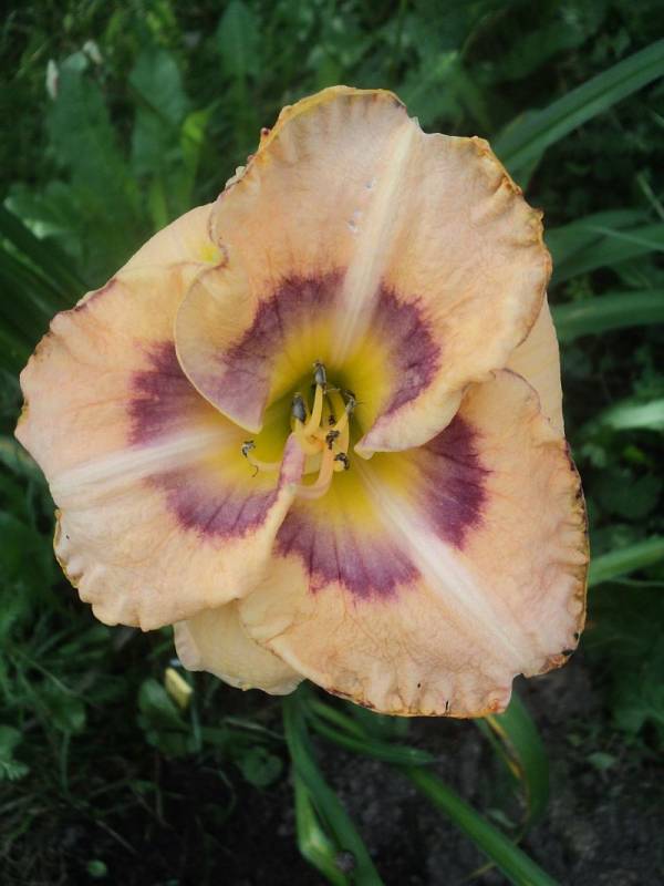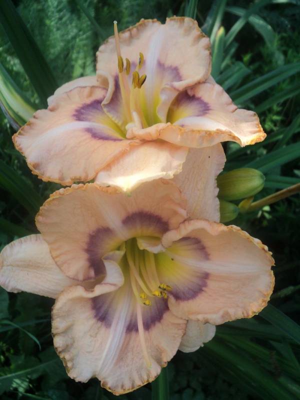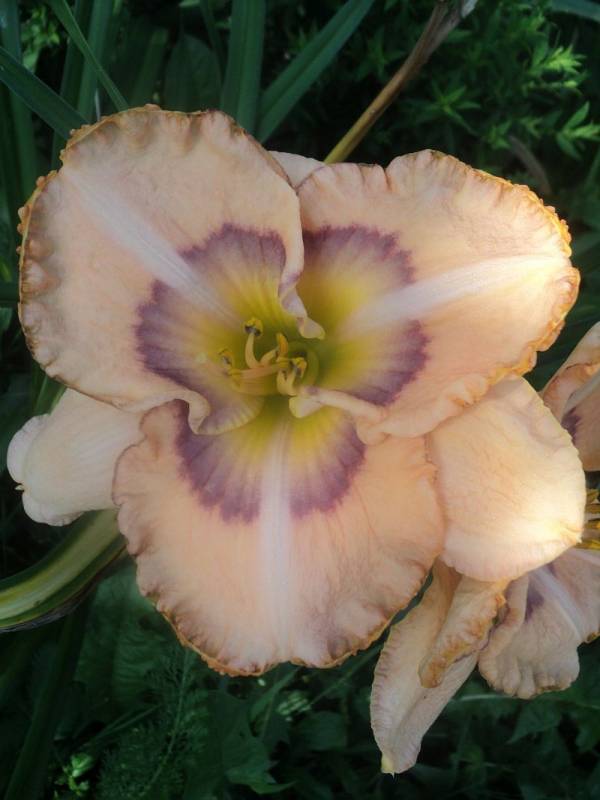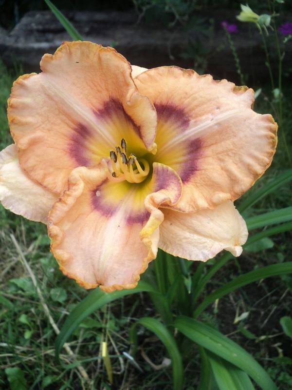 Kwiaty: kwiaty w kolorze cilistego róźu z odcieniem brzoskwiniowym ,dwubarwne oko przechodzące z fioletu w rozmyty lila róż w kierunku żółtej gardzieli. Petale szerokie, przekreślone jaśniejszymi wstęgami, obramowane delikatną falbanką zakończoną wąskim, fioletowo złotym obrysem. Wielkość kwiatu ok 13 cm.
