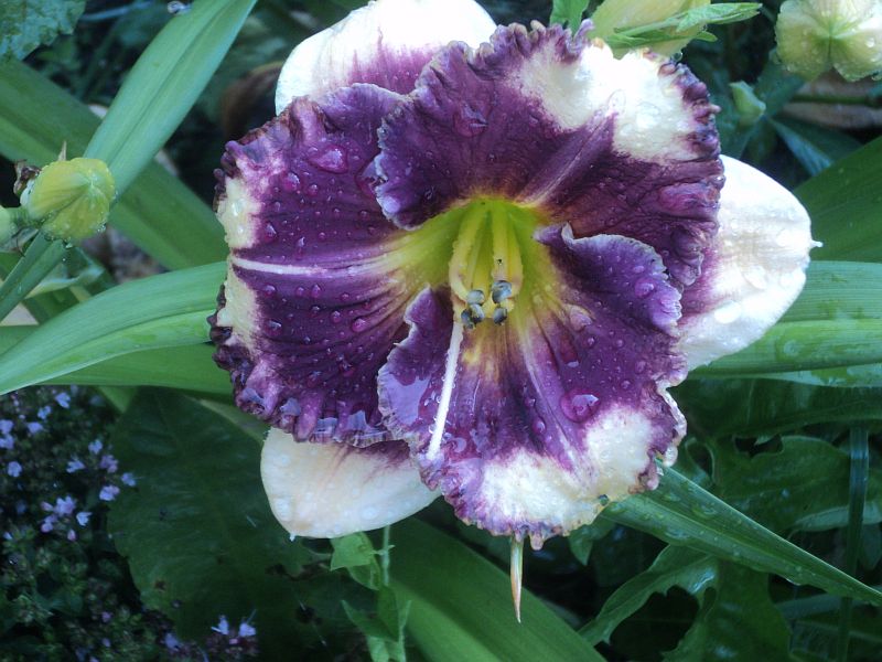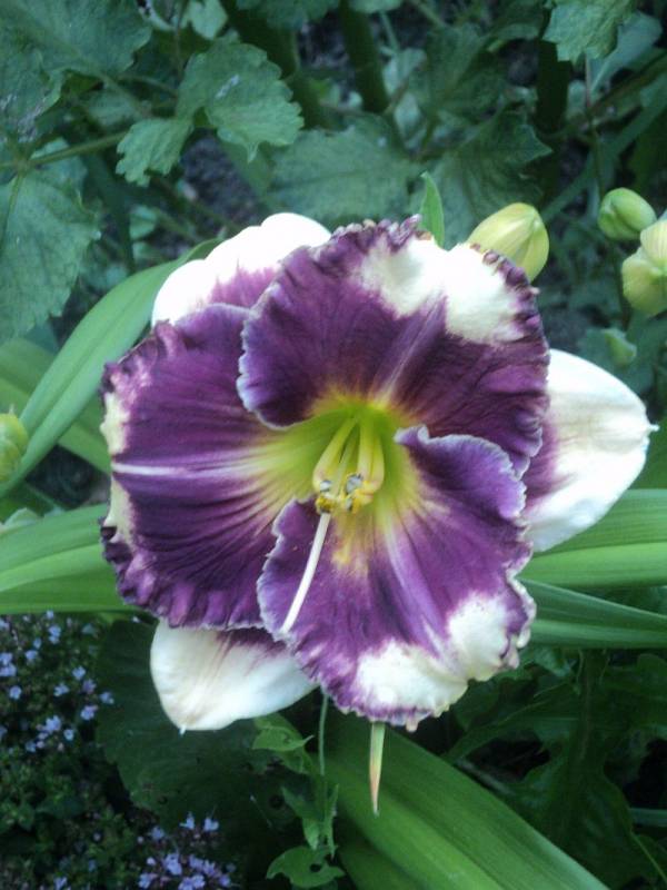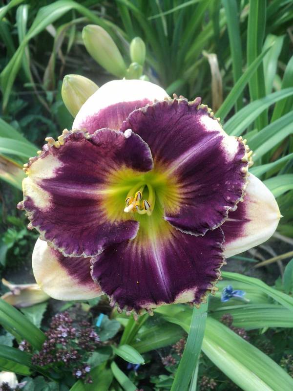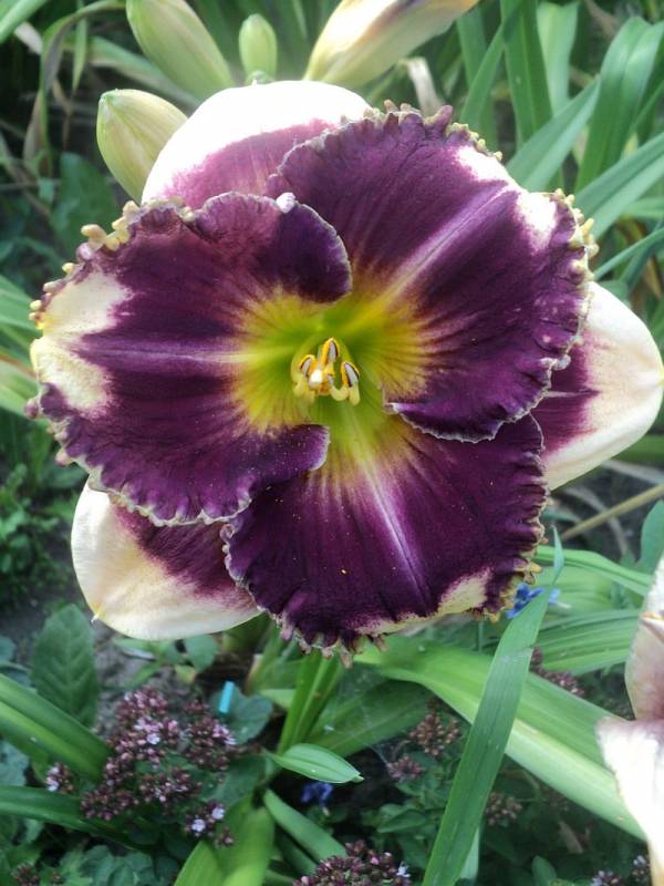 Kwiaty: kwiaty w kolorze kremowym z szerokim śliwkowo-fioletowym okiem , płatki wykończone falbaną w kolorze oka . Gardziel cytrynowo- zielona .Wielkość kwiatu ok 14 cm.
