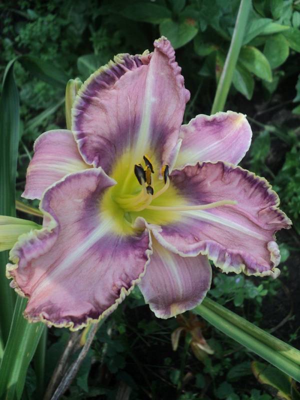 Kwiaty: kwiaty w kolorze fioletowo-jagodowym ,z fioletowo - niebieskim okiem , gardło żółto-zielone .Krawędź płatków wykończona falbaną w kolorze oka i zieleni.. Wielkość kwiatu ok 15 cm.