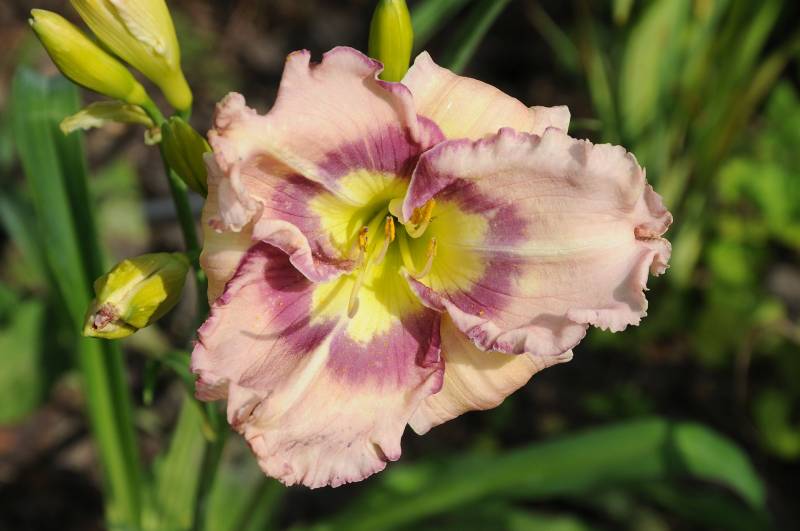 Hodowca: Shooter-E., 2007 Wysokość: 75-80 cm Kwiat: 14cm, różowo- fioletowy z ciemniejszym lawendowym okiem i zielonym gardłem. Delikatna falbanka wykończona na fioletowo Termin kwitnienia: lipiec, może powtarzać