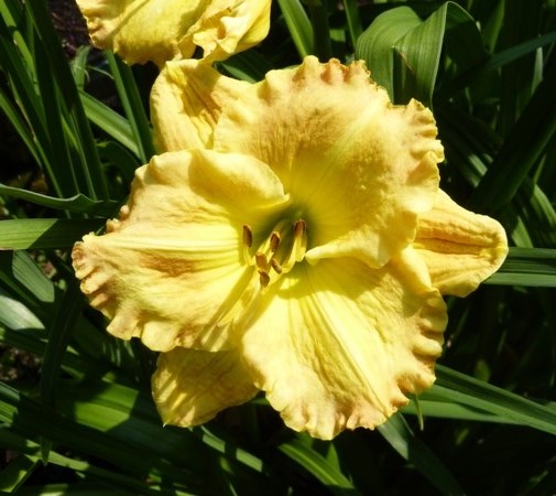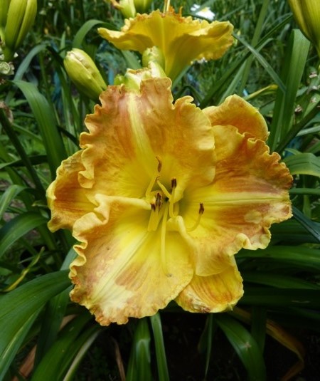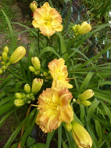 kwiat 15 cm, złoty "przeczesany" zmieszany (?) brązem z ogromną lemonkowo żółtą gardzielą, podobno pachnie