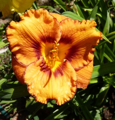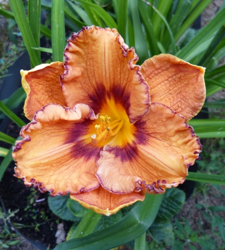 kwiat 13 cm, ciepły pomarańczowy z atramentowo fioletowym okiem i lamówką i żółto pomarańczową gardzielą