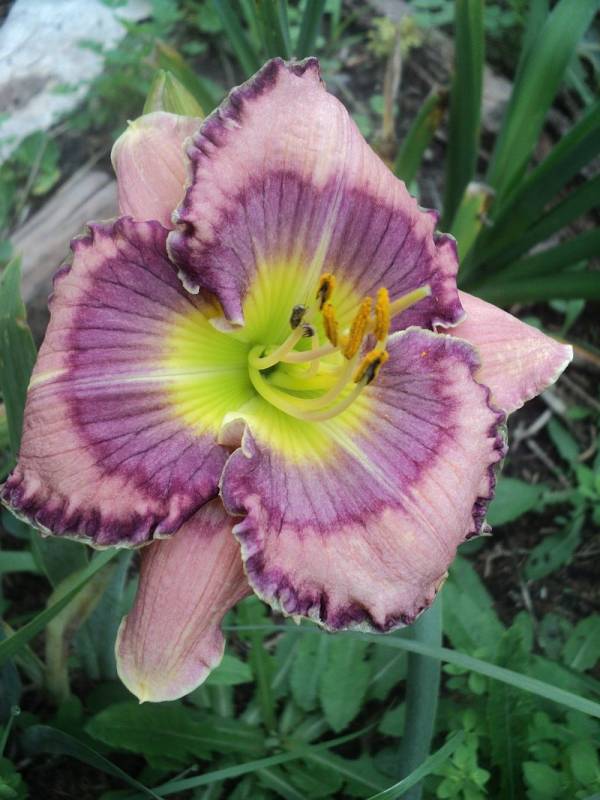 Kwiaty:Kwiaty jasno różowe z niebiesko lawendowym okiem i dwubarwną biało- lawendową falbanką , gardło zielono-żółte . Wielkość kwiatu ok 14 cm.