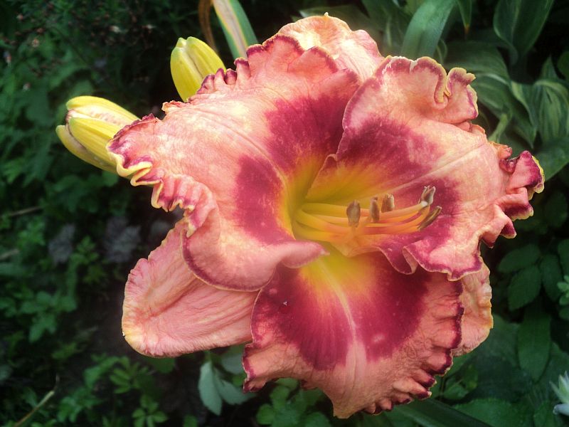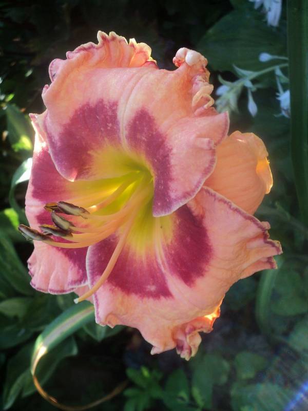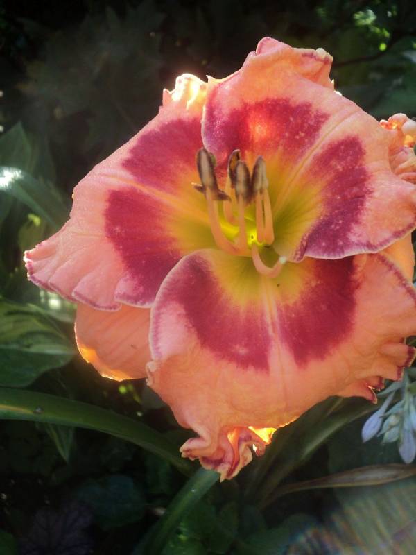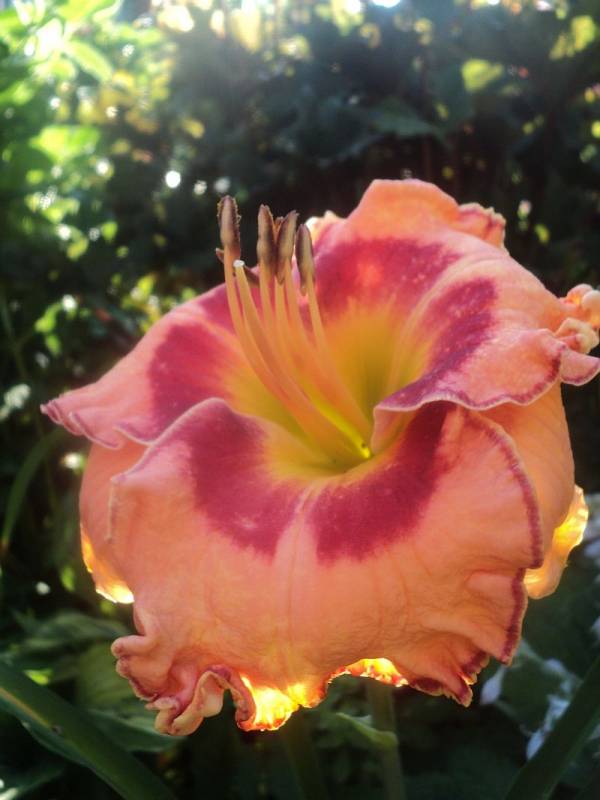 Kwiaty: kwiaty mają kolor pomarańczowo- różowy z czerwonym okiem i takim samym kolorem krawędzi płatków , gardło żółto- zielone Wielkość kwiatu ok 17 cm.