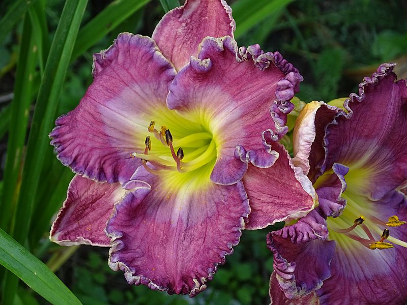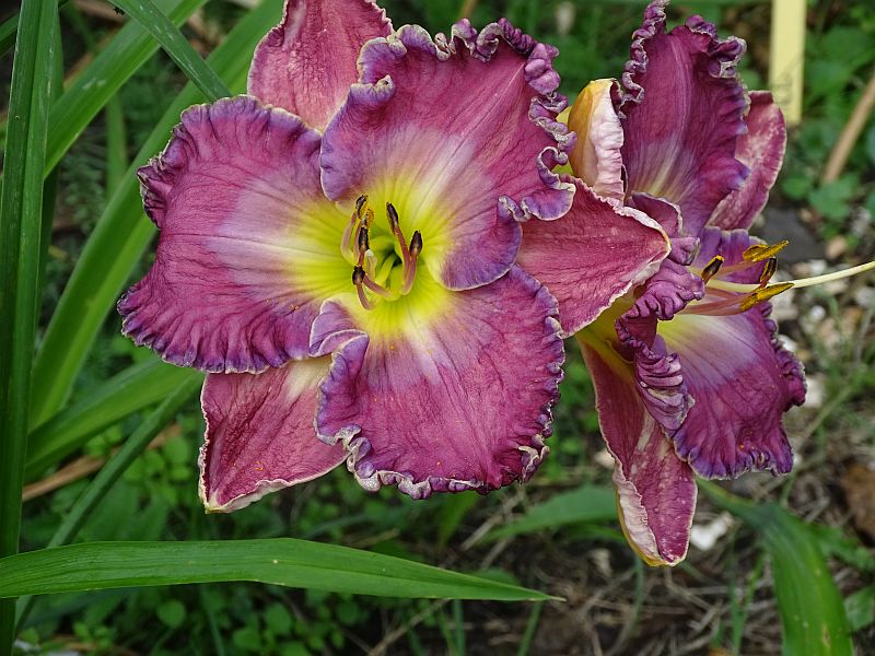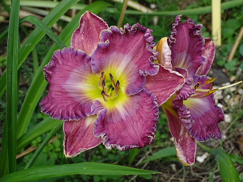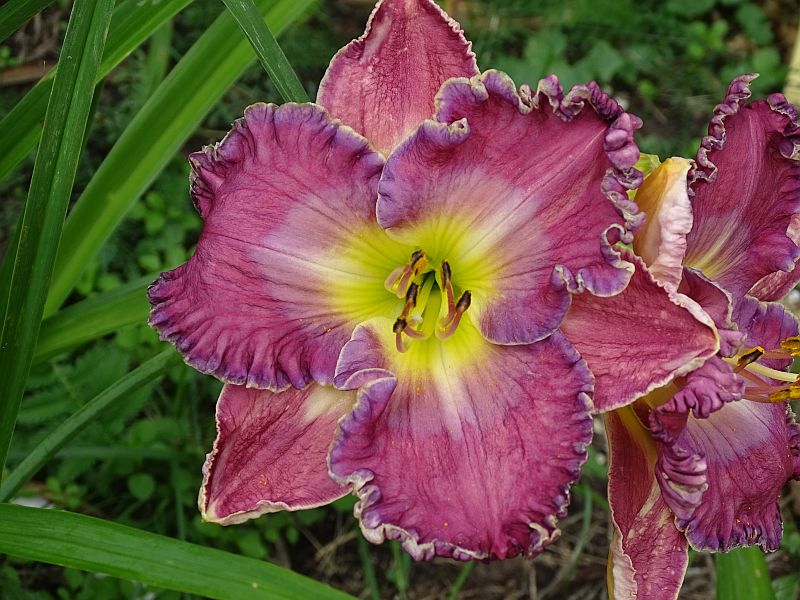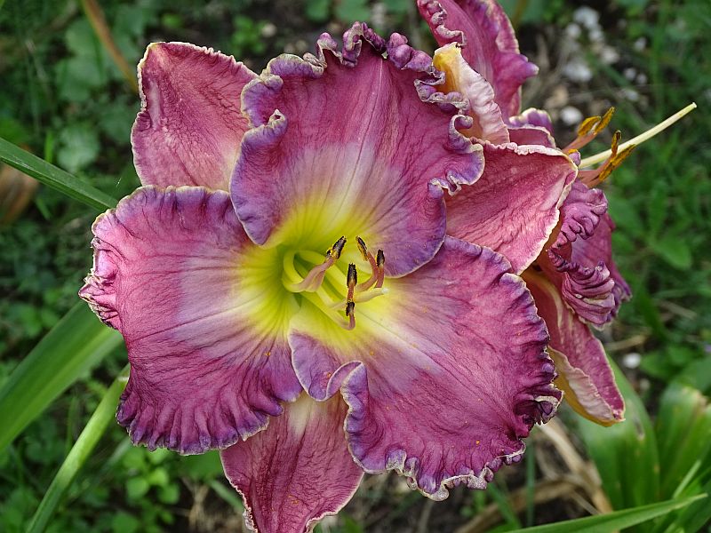 Hodowca: Mitchell-K., 2007 Wysokość: ok 70 cm Kwiaty:Kwiaty ametystowe z rozmytym niebieskim okiem , piękną , niebiesko -kremową falbanką oraz zielonym gardłem .Wielkość kwiatu ok 15 cm. Stanowisko: słoneczne do półcienistego. Mrozoodporność: zimuje bez okrycia. Uwagi :