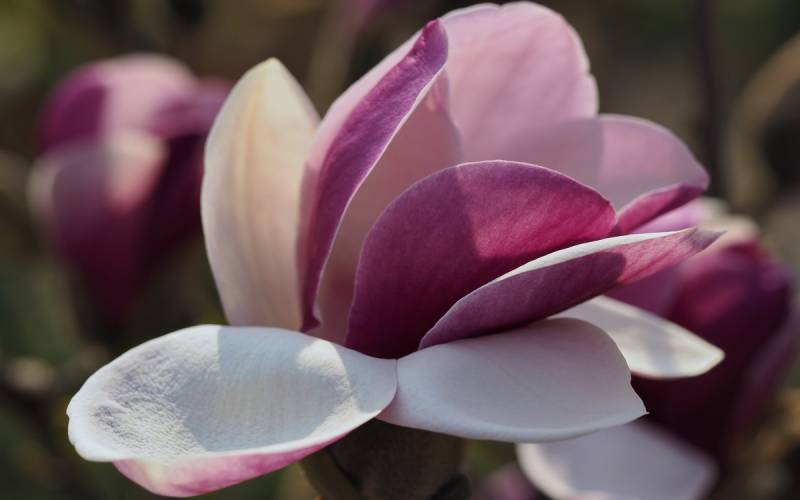 Magnolia Satisfaction czaruje elegancją dużych kwiatów, z zewnątrz mają ciemnoróżowy kolor a wewnątrz są niemal białe. Delikatnie pachną.
