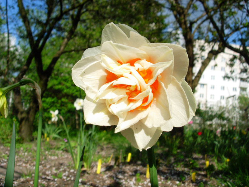 Narcissus poeticus. Zazwyczaj to o nim myślimy kiedy używamy nazwy narcyz, jednak narcyzy to nie tylko obłędnie pachnące białe kwiaty z małym przykoronkiem - żółte żonkile z trąbiastym "czymś"na miejscu przykoronka to też narcyzy. W Polsce można uprawiać w gruncie całkiem sporo gatunków: wspomnianego
