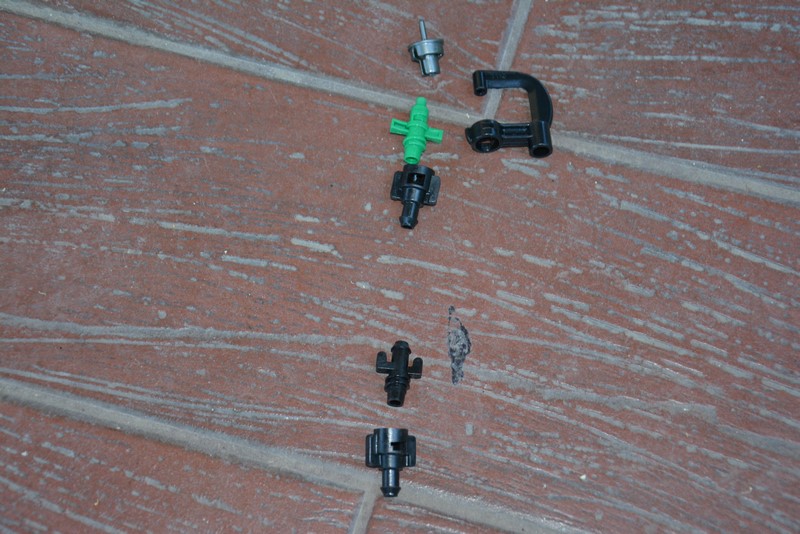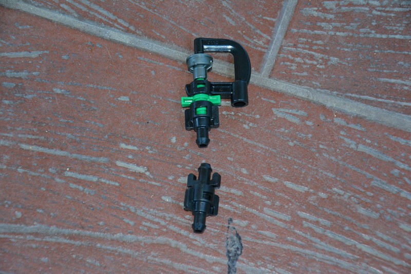 Patrząc od góry mamy wirnik (to szare), korpus (to czarne po prawej), dyszę (to zielone) i podłączenie wężyka (to czarne pod zielonym). Montuje się z tego (poprzez skręcenie) mikrozraszacze pokazane na poprzednim zdjęciu. Dwa dolne elementy służą do podpięcia zraszacza do rury zasilającej, o której za chwilę.