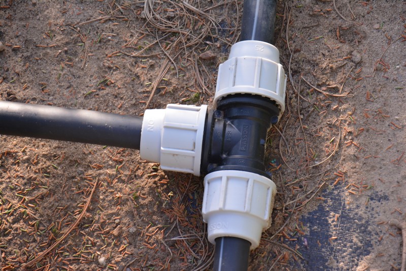 Przebieg linii zasilającej można właściwie dowolnie kształtować. Zależy to mocno od kształtu rabat, wielkości roślin, ciśnienia wody w instalacji itd. Można stosować różnego typu rozgałęźniki (koszt trójnika ok 8 zł). Kolanek nie warto stosować, bo rura zasilająca daje się dobrze formować. Wszelkie kształtki do kupienia za parę złotych w każdym składzie lub markecie budowlanym.