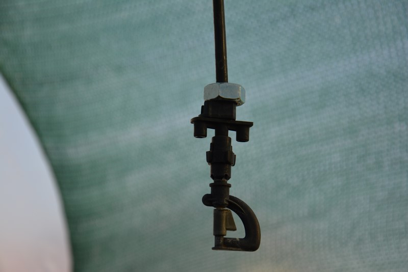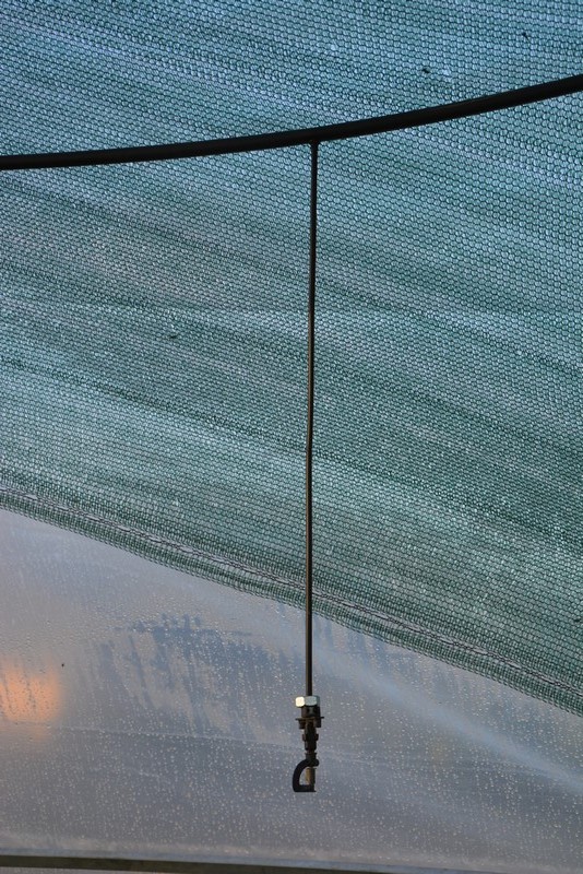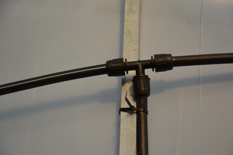 Na drugiej fotce pokazałem na dole dwa elementy służące do łączenia spryskiwacza z rurą zasilającą. Sam spryskiwacz łączy się z tymi elementami wężykiem 7/4 mm (typowy w systemach nawadniających, do kupienia w każdym sklepie z nawodnieniami, koszt ok 1 zł za metr), który naciąga się na końcówki. Warto przed naciąganiem zanurzyć końcówki wężyka we wrzątku (staje się bardziej elastyczny). Wężyk kupujemy z metra i przycinamy na wymaganą długość (w zależności od wysokości, na jakiej chcemy go zamontować, czyli w przybliżeniu nieco krócej, niż długość pręta, na którym go montujemy). Do jego przycinania możemy użyć zwykłych nożyczek. Montowanie do węża zasilającego wygląda tak: