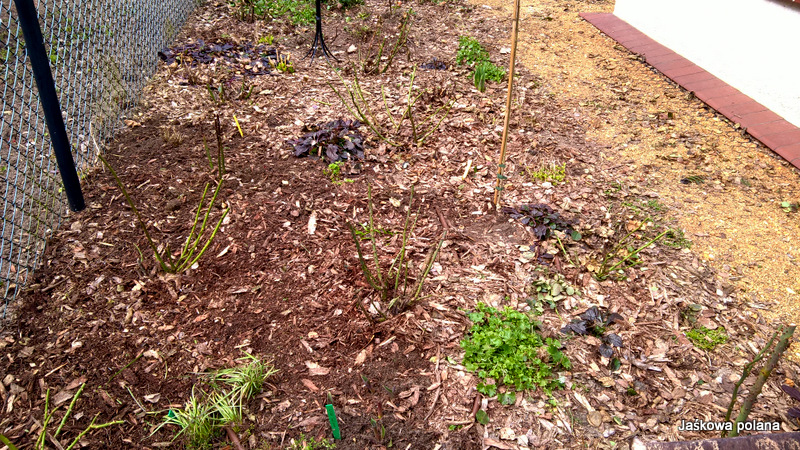 Proszę bardzo, będzie o różach. Nie czekałam z przycięciem róż do czasu aż zakwitną forsycje bo prawdopodobnie w tym czasie będę poza domem :owady dlatego muszę teraz ostro zabrać się do roboty coby nie mieć zaległości. Dzisiaj było pierwsze pielenie i spulchnianie rabat a trawiasta dostała mulcz z przerobionego obornika.