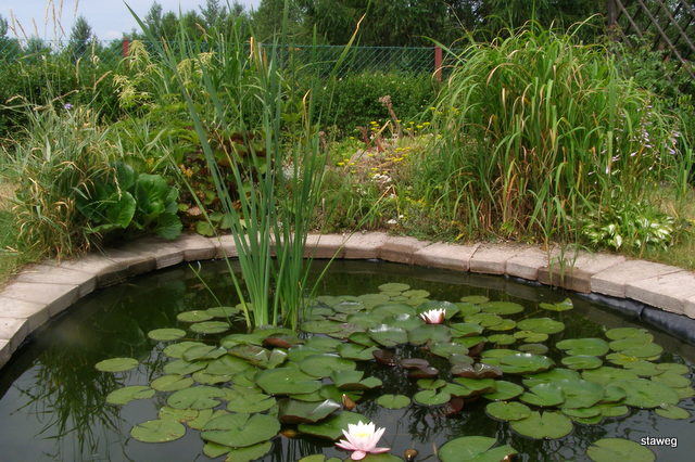 W trakcie urządzania otoczenia domu zdecydowałem, że chodniki a’la kostka wykonamy sami. Zakupiłem stosowną formę, cement i pigment, a piasek braliśmy własny na terenie ogrodu. Powstał wkrótce spory dół, który postanowiłem nieco uformować, wyłożyć folią i stworzyć oczko wodne. Tak więc, jedno z kół-rabatek zmieniło się w sadzawkę, a „ogródek” (bo tak nazywaliśmy tę część ogrodu) wyglądał jak na zdjęciach.