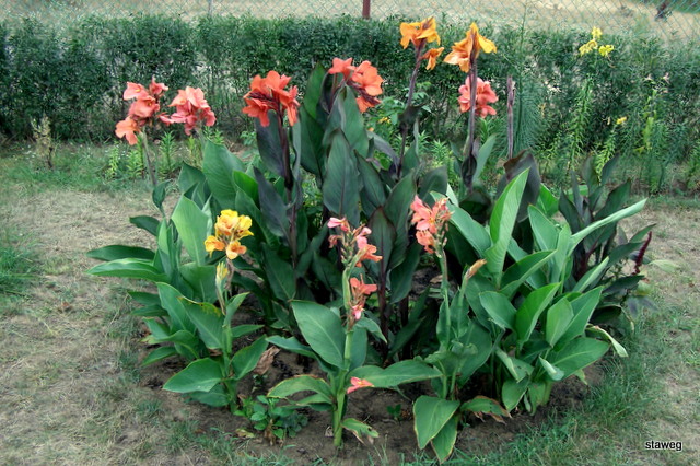 Szybko też zmieniła się koncepcja symetrycznych kół rabatowych. Lewe, bliższe domu oraz centralne połączyły się w wielokształtną dużą rabatkę, a pozostałe są ciągle są powiększane, tak żeby coś jeszcze dosadzić. Przeważnie – raz na jednej, raz na drugiej – egzystują kanny.