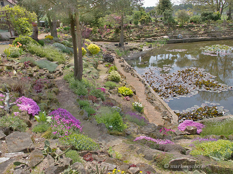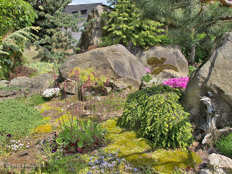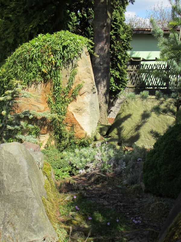 Zdjęcia nie będą zamieszczane chronologicznie, bo nie o to przecież chodzi... spacery nawet te wirtualne dostarczają niezapomnianych wrażeń i mogą być inspiracją dla kolejnych wielbicieli założeń skalnych. Na każdym kroku widać tam z jak wielkim smakiem i miłością skomponowane zostały nasadzenia roślinne oraz kamienne aranżacje. Głównym budulcem skalnym użytym do budowy tego ogrodu skalnego był piaskowiec, pochodzący z pobliskich kamieniołomów.