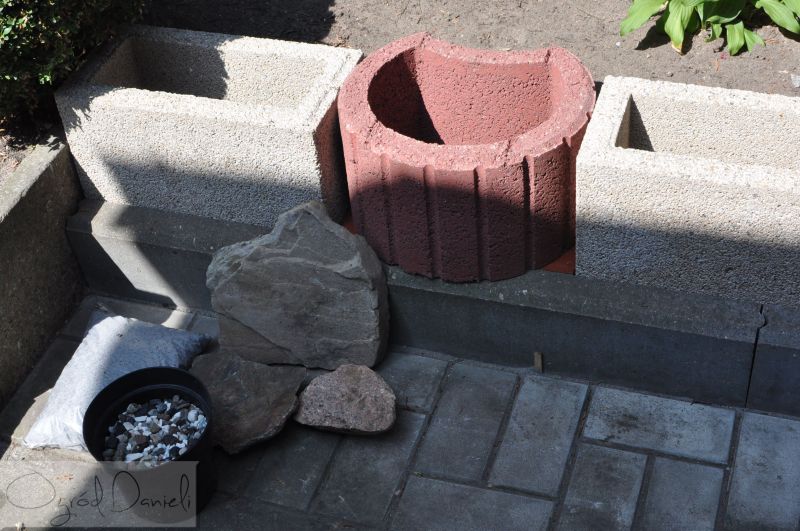 Tadeusz ustawił mi dwa prostokątne gazony, a w środku jeden okrągły o średnicy ok. 35 cm (średni). Gazony takie są dostępne w marketach budowlanych, ten czerwony kosztował niewiele więcej niż 6 zł. Widoczne także kamienie do szczelinowca, keramzyt i drobne kamyki